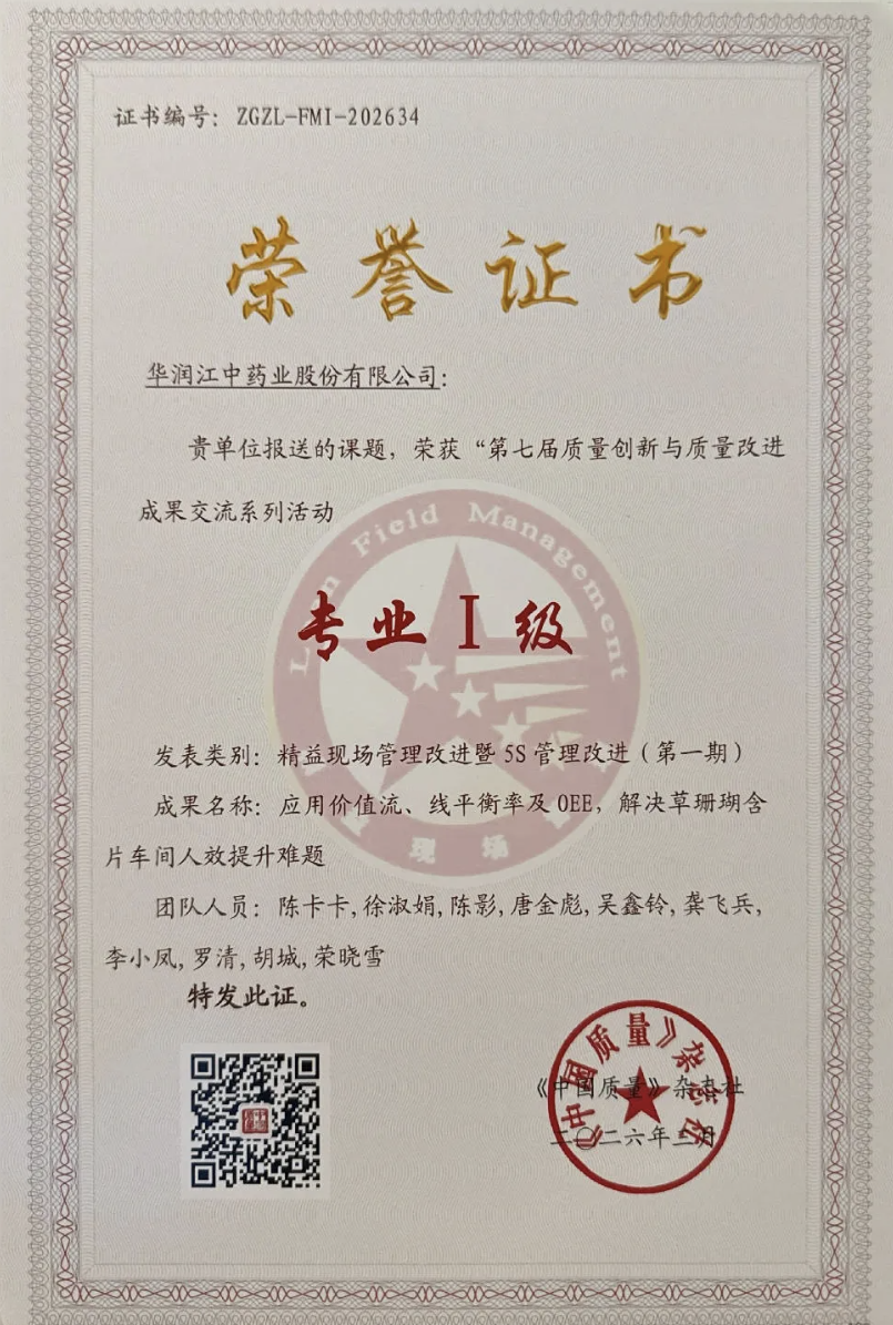 华润江中提报的《应用价值流、线平衡率及设备综合效率(OEE),解决草珊瑚含片车间人效提升难题》成果案例,获评“精益现场管理暨5S管理改进”专业I级奖项(一等奖)。